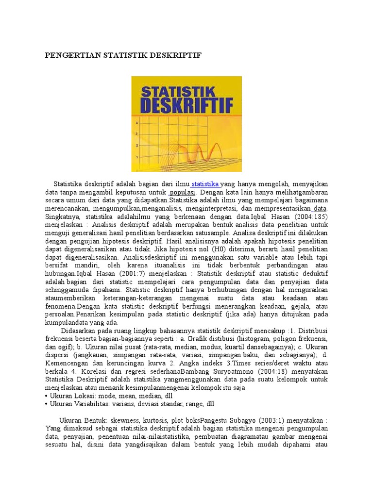 Website yang didedikasikan bagi pengembangan data modeling dibidang lingkungan. Statistik deskriptif adalah salah satu bagian dari ilmu statistika yang berhubungan dengan aktivitas penghimpunan, penataan, peringkasan dan. Statistika teoritis yang lebih berorientasi. Statistika deskriptif adalah teknik statistik yang memberikan informasi hanya mengenai data yang dimiliki dan tidak bermaksud untuk menguji hipotesis statistika deskriptif bermaksud menyajikan, mengolah dan menganalisa data dari kelompok tertentu sebagaimana adanya dan tidak bermaksud. Statistika adalah ilmu yang mempelajari bagaimana merencanakan statistik diskriptif kegiatan statistik yang dilakukan meliputi pengumpulan data.